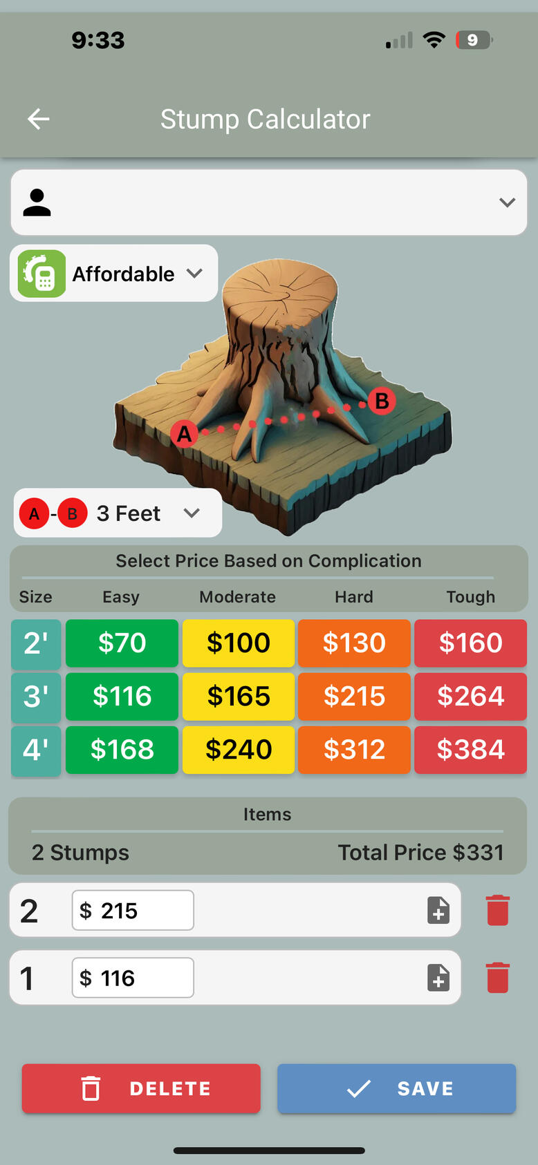Feature: Adjustable rates based on stump size, complexity, and various pricing strategies.